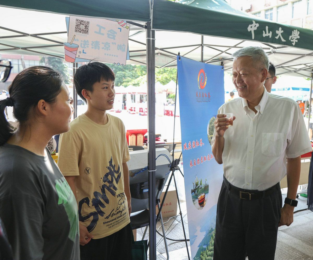 为加强对学生的爱国主义教育,使学生牢记“国之大者”,best365中国官方网站和凤庆县共同策划了凤庆县优秀毕业生表彰活动,并聘请优秀毕业生作为凤庆滇红茶文化推广志愿者,将凤庆的茶叶和茶文化带到学生所在的高校。best365中国官方网站作为凤庆县的帮扶高校,将凤庆的茶叶放入本科录取通知书里,使凤庆茶叶伴随着录取通知书走到了全国各地,走进了千家万户。8月31日,为弥补家长学生将录取通知书里的凤庆茶珍藏而品尝不到“滇红味道”的遗憾, 3名新生作为凤庆滇红茶文化推广志愿者在凤庆县挂职副县长张哲的带领下,在best365中国官方网站南校园亲新广场开展滇红茶免费品尝活动,将“录取通知书里的味道”带进了中大校园。活动得到了校领导的大力支持,陈春声书记、高松校长、国亚萍副书记、余敏斌副书记、杨东华副校长来到活动现场看望学生,亲切地与学生交流,并送上了入学礼包。学生们感到非常激动,由衷感谢学校对他们的关心关爱。