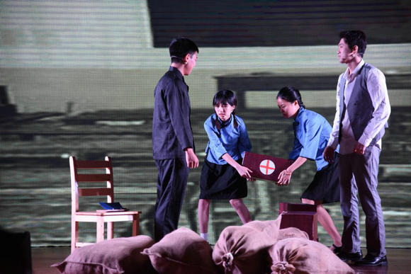 当日本侵华战火在“影子戏”燃烧时,新生也加入了抢救性搬离教学书籍、器材的行列。在“救护团成员”的引导下,新生被带入了“躲避炮火”的“战壕”。“战壕”里有三列草席,供同学们坐下观看影片。这一幕以“影子戏”的戏剧形式呈现。1932年淞沪战役爆发,从广州一路北上的光华救护队,经长途跋涉,以最快速度抵达上海前线,在枪林弹雨中拯救伤员,冒着失去生命的风险,在前线组成最坚定的医疗支援队伍。