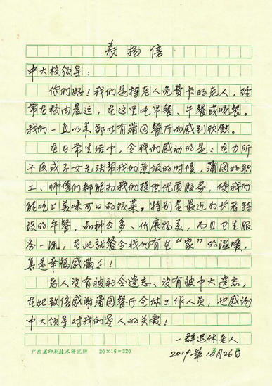 产业集团饮食服务中心开设“长者专窗”,解决离退休老教职工吃饭难问题。9月份,在蒲园餐厅推出“长者专窗”,使许多离退休老教职工终于可以不用买菜、不用做饭,出门走几步路就能吃上香喷喷的饭菜。10月23日,总务处、离退休处、产业集团、离退休协会召开会议听取对“长者专窗”的意见和建议。针对部分老教职工反映菜式品种单一、价格较高等问题,饮食服务中心组织专业厨师队伍进行研究,当天即推出12元/份的长者套餐,每天有6款不同的主菜、配菜,2款青菜及汤可供选择,得到离退休老教职工的好评,收到离退休老教职工的感谢信。