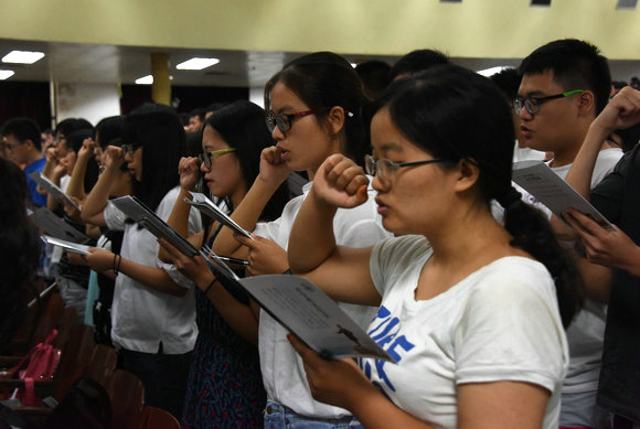 新生入学宣誓由李萍副书记(珠海校区)、颜光美副校长(广州校区东校园、南校园、北校园)分别领誓,全体新生举起右手庄严宣誓:“谨记中山校训,肩负时代使命;恪守学术道德,崇尚科学理性;尊师重道守法,勤学求是创新”。医学生入学宣誓由余敏斌副校长领誓,全体医科新生举起右手庄严宣誓:“健康所系,性命相托。当我步入神圣医学学府的时刻,谨庄严宣誓:我志愿献身医学,恪守医德,尊师守纪,刻苦钻研,精益求精。我决心竭尽全力除人类之病痛,助健康之完美,维护医术的圣洁和荣誉。为人类身心健康奋斗终生。”