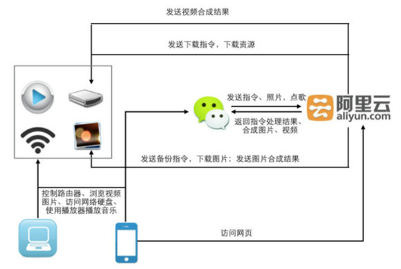 参赛作品“基于微信平台的家庭娱乐系统”是一款基于openwrt系统的智能路由器,采用微信平台进行管理,并集成Airplay播放器、远程下载、照片快速同步分享等功能,将路由器作为家庭网络的中心枢纽,用户可在手机微信上简单快捷地远程控制家庭网络预先下载电影等资源,与好友在同网络下上传照片分享,更可以享受在微信上快速美化图片、制作视频等娱乐功能,体验家庭娱乐系统一体化的完美快感。路由器外接阿里云服务器,平台化的管理,使每台路由器功能一致,却又独一无二。