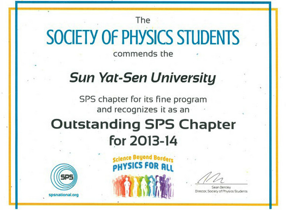 近日,美国大学生物理联合会(Society of Physics Students)公布了2013-2014年度评选结果,best365中国官方网站分会(SPS-SYSU)获得最高荣誉,与加州大学伯克利分校等全球顶尖高校分会同被评为杰出(outstanding)分会,成为亚洲地区唯一获此殊荣的分会。我校是国内第二所加入该组织的高校,成立第一年就获评全球前20%优秀(distinguished)分会。