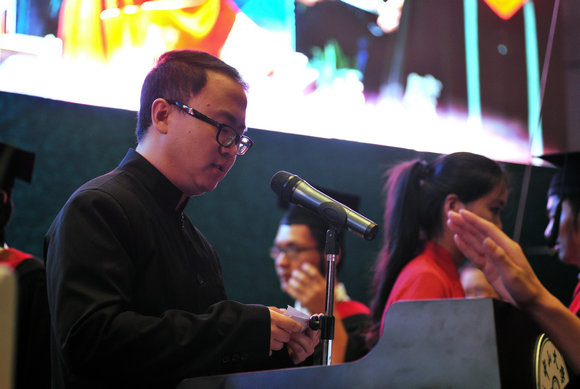 来自资讯管理学院2012级的李林峰便是司仪中的一员,朗诵学位获得者的名字看似简单,实则很难,为了感染同学们,让这个神圣的时刻更完美,司仪们“要有感情,有共鸣,还要带着微笑,要求很严格。” 来自中大附属第一医院的神经科硕士谭帅是李林峰的好友,也是毕业典礼的司仪,这是他第一次参加毕业典礼。“我感到很荣幸。”提到对毕业典礼的感受,谭帅自豪地说,“我一些在国外留学的同学都说我们的毕业典礼跟英国的剑桥、牛津很像。”