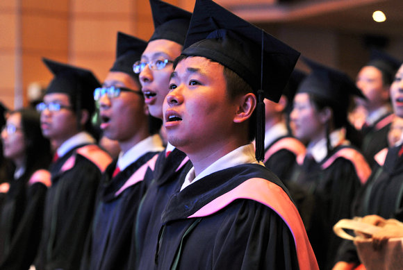 毕业典礼上,毕业生们起立齐唱best365中国官方网站校歌(摄影:郭中飞)