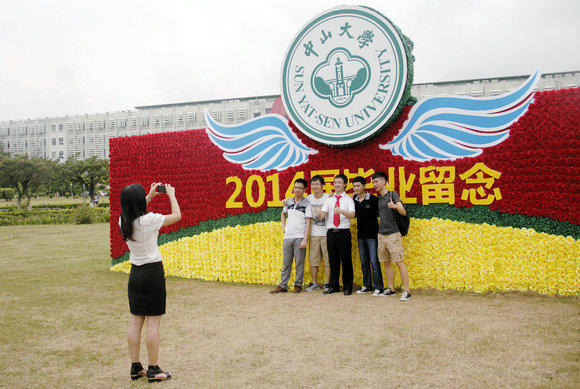 逸仙大道路旁,上百张2014届毕业生旧照展板贴满了道路边的宣传栏,他们在这里的点点滴滴如剪影映入眼帘,是对他们大学生活的总结、自我成长的勉励,也是对即将离开母校的留恋和怀念。“亚洲第一长教学楼”前的草坪上,竖着一面由红、绿、黄三种颜色的花朵排列而成的毕业花墙,红色花朵正中,嵌着“2014届毕业留念”大字,其上展开了两只蓝色的翅膀,托起校徽。吸引了不少毕业生前往留念,“咔嚓”一声,定格下或搞怪合照或恩爱情侣照或个性单人照……