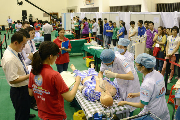 时间与质量的平衡问题,是全国高等医学院校大学生临床技能竞赛的一大难点。为期两天的总决赛涵盖内科、外科、妇产科、儿科、急诊科、麻醉科、眼科、皮肤科、耳鼻喉科、病理科、影像科等128项临床技能操作及相关知识点。本届总决赛共设置5轮赛道竞赛,每轮25至30分钟,内含站点4至5个,操作复杂程度不等。对该难点的探索亦贯穿于中大参加全国高等医学院校大学生临床技能竞赛的五年历程中:2010年,中大代表队首次赴京参加全国赛,由于过于注重操作的细致,影响比赛速度,第一轮即被淘汰;2011年,中大代表队经过针对性的艰苦训练再次赴京参赛,以总分第一的成绩一举夺得第二届全国赛特等奖;2012年,中大代表队在北京蝉联第三届全国赛冠军;2013年,第四届全国赛移师京外,于中南大学举行,中大代表队再次问鼎冠军;今年,第五届全国赛在中大举办,中大代表队再下一城,喜获“四连冠”。