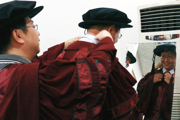 “毕业典礼现场热闹而肃静。唱校歌时,心情很激动;特别是教授进、退场时,告别曾经教导自己的老师们,更加激动。”