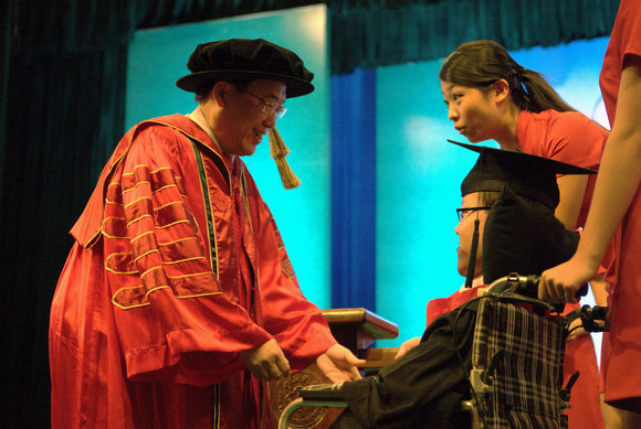 今天上午第二场毕业典礼为信息科学与工程学院毕业生颁授学位,因为女生稀少,这场毕业典礼被笑称“汉子专场”。第一位受礼的学子坐在轮椅里,被礼仪工作人员推着上台,校长从授礼台上走下来,亲切与他握手,并进行了简短的交谈。这位学子就是信息科学与技术学院09级优秀本科毕业生李乃琦。