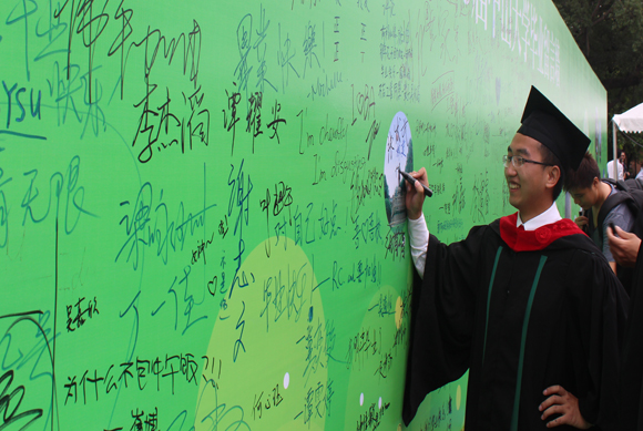 不到半天时间,毕业留言墙上已写满各式留言和签名,表达了毕业学子对母校的怀念。花墙前,一位韩国留学生正与母亲合影,她专程赶来参加儿子的毕业典礼。今天儿子毕业了,她感到很幸福,并希望儿子将来能做自己喜欢的事情。