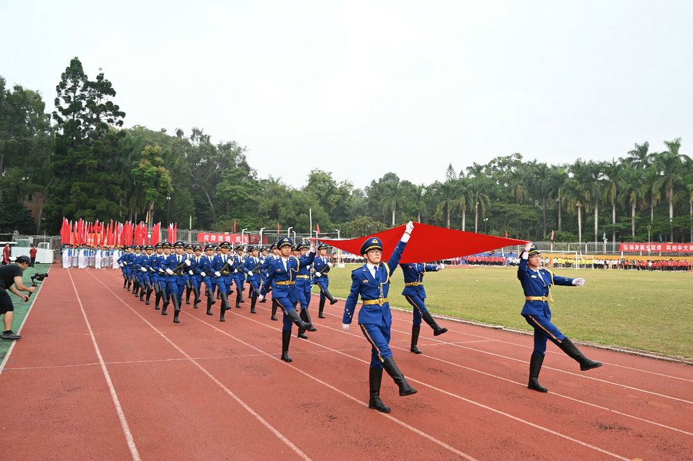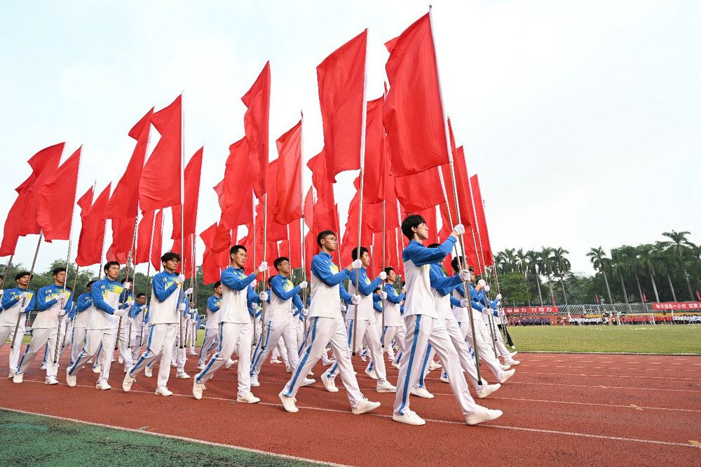 庄严的升旗仪式在嘹亮的国歌声中举行。国旗护卫队的同学们身着戎装,迈着铿锵有力的步伐,护送着鲜艳的五星红旗正步走向升旗台。参加本届运动会近4000名师生面向国旗肃立致敬,注视着五星红旗冉冉升起。