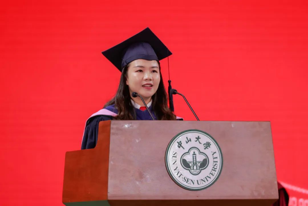 研究生毕业生代表、中国语言文学系硕士毕业生黄思薇,当年受黄文秀书记的激励,毅然决心回乡工作、服务基层。她与大家分享了在村里工作时的体验,勉励大家将小我融入祖国的大我,担当起强国建设、民族复兴的重任,做到无愧于国家的培养,无愧于中大的培养。