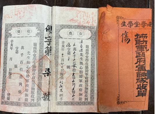 1911年辛亥革命爆发后,岭南学堂学生组织“筹饷队”为广东军政府募捐,共募得5万余元饷款。这是1911年12月21日岭南学堂学生筹饷队募捐收单以及筹饷队印章。