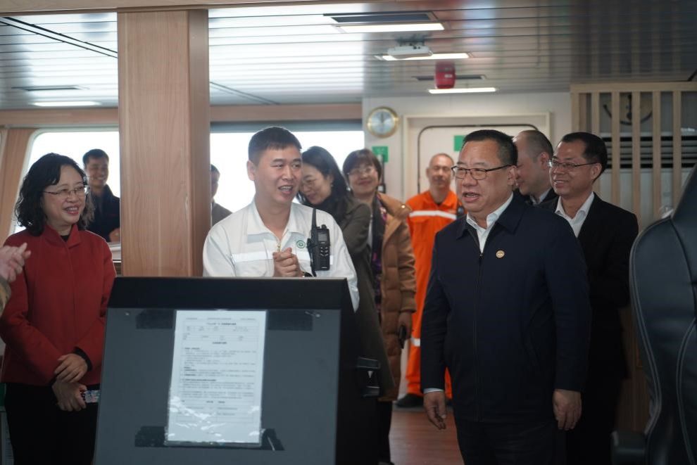 朱孔军书记等领导专家登船慰问全体船员,与船员们亲切交谈,了解工作生活近况,感谢他们为学校海洋科考事业奋战在第一线,并鼓励全体船员继续发扬艰苦奋斗、勇于探索的精神,争取更大的发展突破。