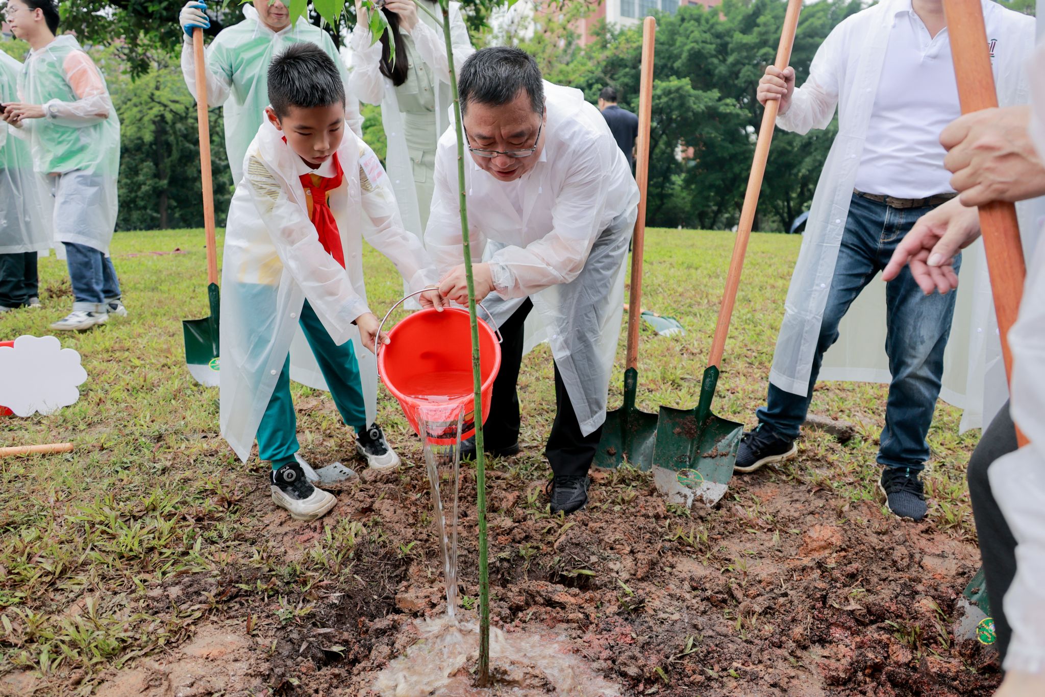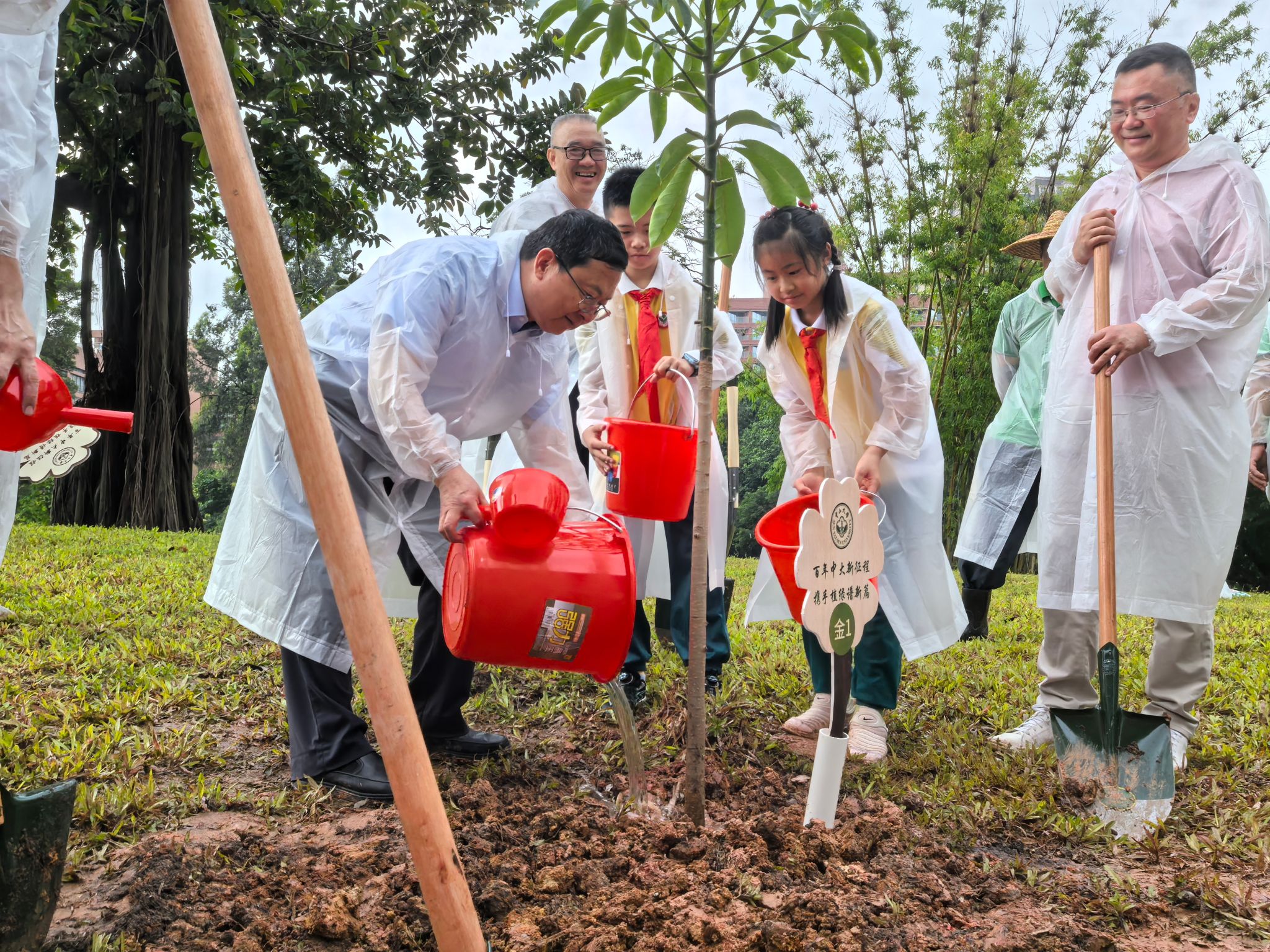 此次活动共栽种金花木棉15棵、美丽异木棉10棵。据生命科学学院俞陆军副教授介绍,金花木棉是广州市花的珍稀变种,花序通体金黄,因天然繁殖存在基因重组障碍,三十余年间仅存零星植株,被誉为植物界“活化石”,其耀眼的金色象征“敢为天下先”的精神。美丽异木棉由华南师范大学赠送,承载着两所高校间深厚的情谊。