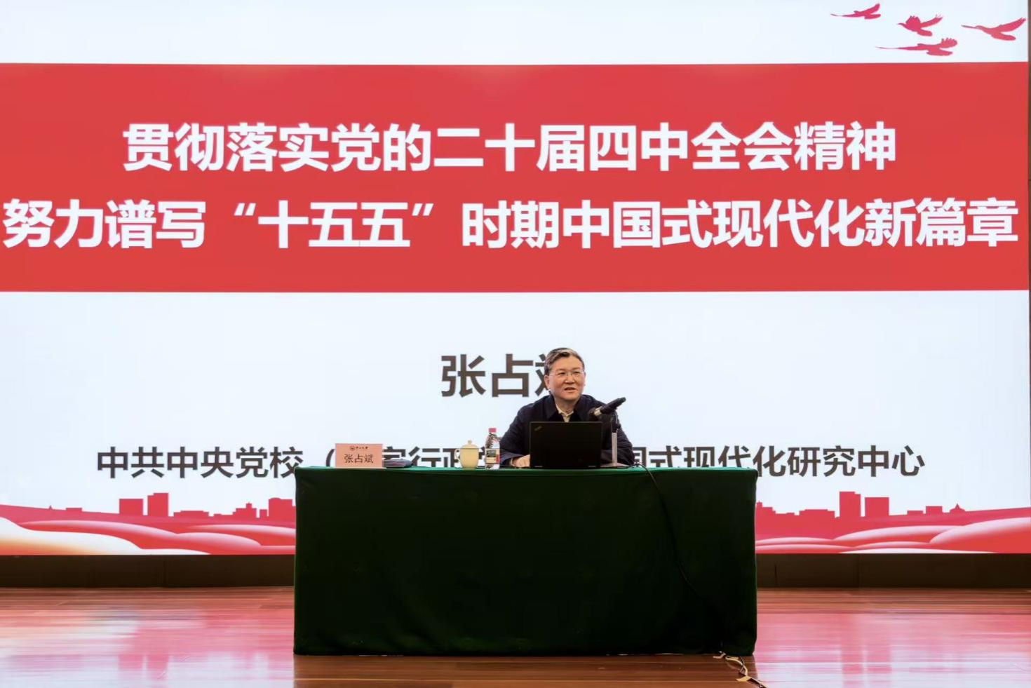 张占斌以“贯彻落实党的二十届四中全会精神,努力谱写“十五五”时期中国式现代化新篇章”为题,从“十四五”规划完成情况、国内外形势和中国式现代化任务、“十五五”规划亮点特点、“十五五”规划重要原则四个方面作辅导报告。他指出,“十四五”时期,在习近平经济思想指引下,全党全国各族人民完整准确全面贯彻“创新、协调、绿色、开放、共享”的新发展理念,交出了一份高质量发展答卷。当前,国际形势呈现“动荡”与“重构”的双重特征,国内形势“改革”与“机遇”并存,站在“十五五”规划的起点,要牢牢把握中国式现代化主要任务。