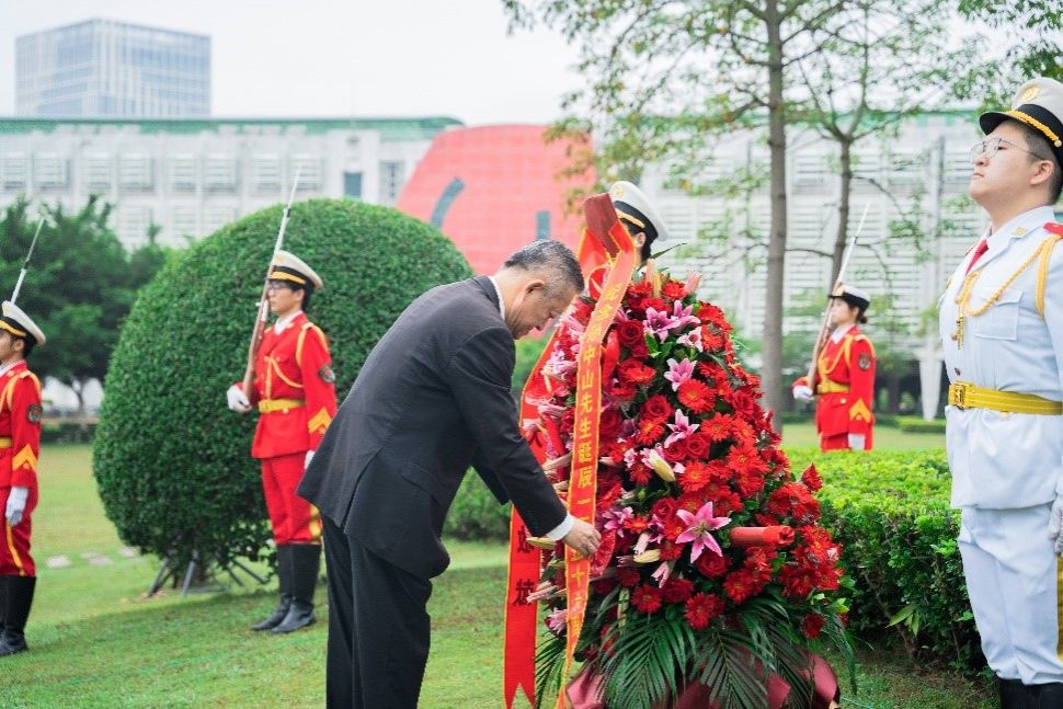 广州校区三个校园和珠海校区分别举行了向孙中山先生铜像献花仪式。随着敬献花篮曲响起,国旗班代表将花篮稳步抬至孙中山先生铜像基座前。主礼校领导缓步上前,仔细整理花篮缎带。“纪念孙中山先生诞辰一百五十六周年”的烫金字体映在红色缎带上格外显眼,静静诉说着中大人对中山先生的深切缅怀和崇高敬意。