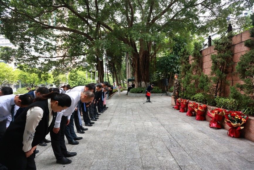随后,全体人员向中山先生铜像行鞠躬礼。主礼校领导带领在场师生代表肃穆绕行,瞻仰先生铜像。