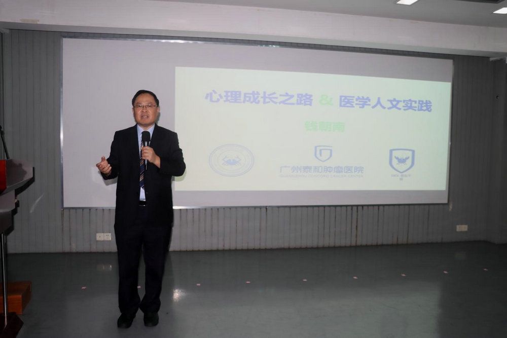 仪式结束后,广州泰和肿瘤医院院长钱朝南教授为师生带来了一场题为“心理成长之路&医学人文实践”的专题讲座。钱朝南院长向大家介绍了成年人心理成熟的六个特征、年轻医护人员的七项基本品质、成功医学家的五种品质等内容,结合案例深入浅出娓娓道来,受到现场师生的热烈回应。