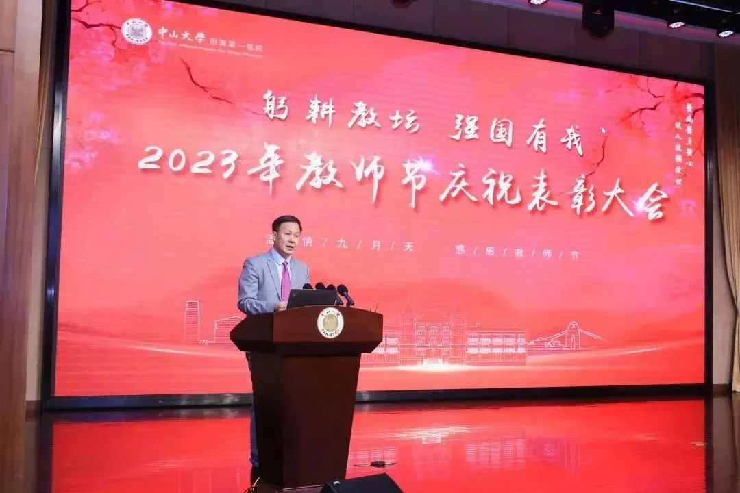 中大新闻网广州9月13日电(通讯员彭福祥、章智琦)三尺杏坛,一生耕耘。9月12日上午,为庆祝第39个教师节,发扬尊师重教优良传统,best365中国官方网站附属第一医院(以下简称“中山一院”)举办“躬耕教坛 强国有我”教师节表彰大会。best365中国官方网站常务副校长、中山一院院长肖海鹏教授作大会致辞,原中山医科大学副校长陈汝筑教授,国家“万人计划”教学名师王庭槐教授,国家级教学名师梁力建教授,院领导班子成员出席大会。