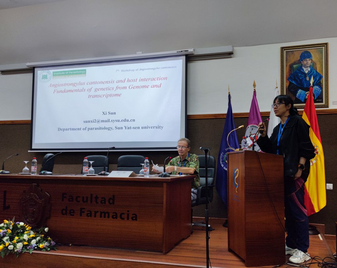 孙希副教授在会上作了题为“Angiostrongylus cantonensis and host interaction Fundamentals of genetics from Genome and transcriptome”的学术报告,全⾯介绍了中⼭医学院在⼴州管圆线⾍与管圆线⾍病的研究历史,重点展示了⼴州管圆线⾍⼴州株全基因组以及寄⽣⾍与宿主互作关系的研究进展,展现了中国在该领域的学术实⼒和国际影响⼒,获得了参会专家的⾼度称赞和认可。代表们希望中⼭医学院能在 2033 年举办陈⼼陶教授发现⼴州管圆线⾍ 100 周年纪念活动。