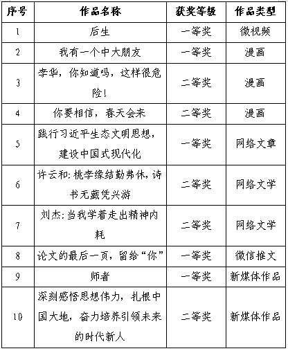 我校报送的《后生》等10项作品获奖。其中,微视频一等奖1项;漫画一等奖1项,二等奖2项;网络文字一等奖1项,网络文学二等奖2项,微信推文一等奖1项,新媒体作品一等奖1项,二等奖1项。