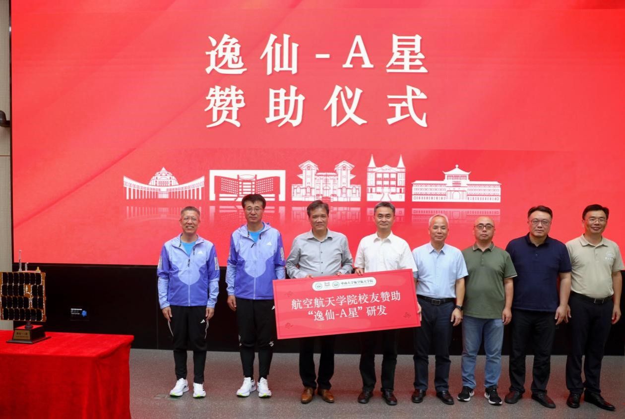 会上举行逸仙-A星赞助仪式。航空航天学院校友会名誉会长陈光明代表学院校友理事会向吴志刚院长交接了赞助“逸仙-A星”研发的铭牌,并与学校领导、学院领导、校友代表一起合影留念。