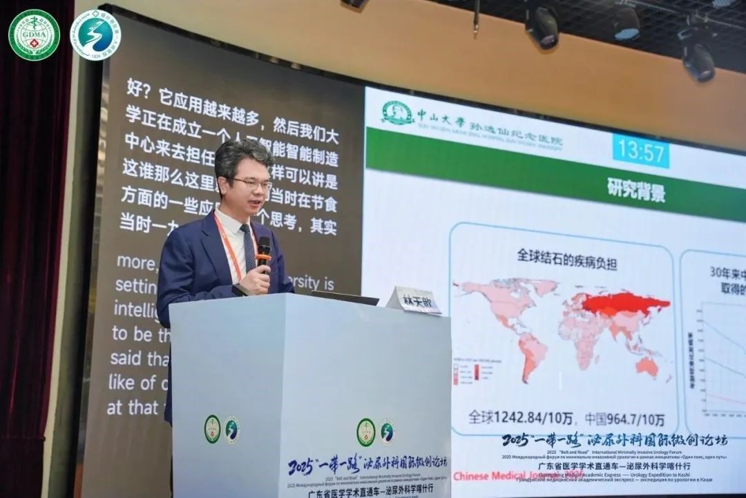 期间,林天歆代表广东省医学会泌尿外科学分会进一步回顾了粤喀两地泌尿外科专业的合作与交流工作,分享了成熟的协作帮扶模式,并以《AI辅助诊断在泌尿系结石中的应用》为题进行学术讲座。