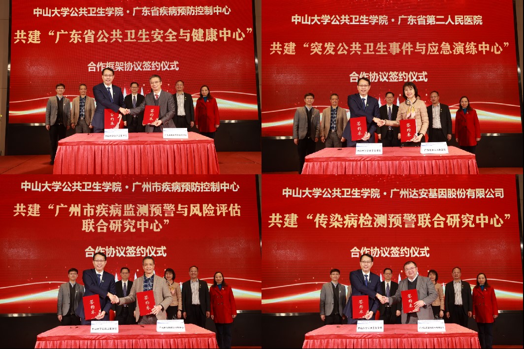 会上,公共卫生学院分别与广东省疾病预防控制中心、广东省第二人民医院、广州市疾病预防控制中心、广州达安基因股份有限公司举行了签约仪式,共签订了4份合作协议。