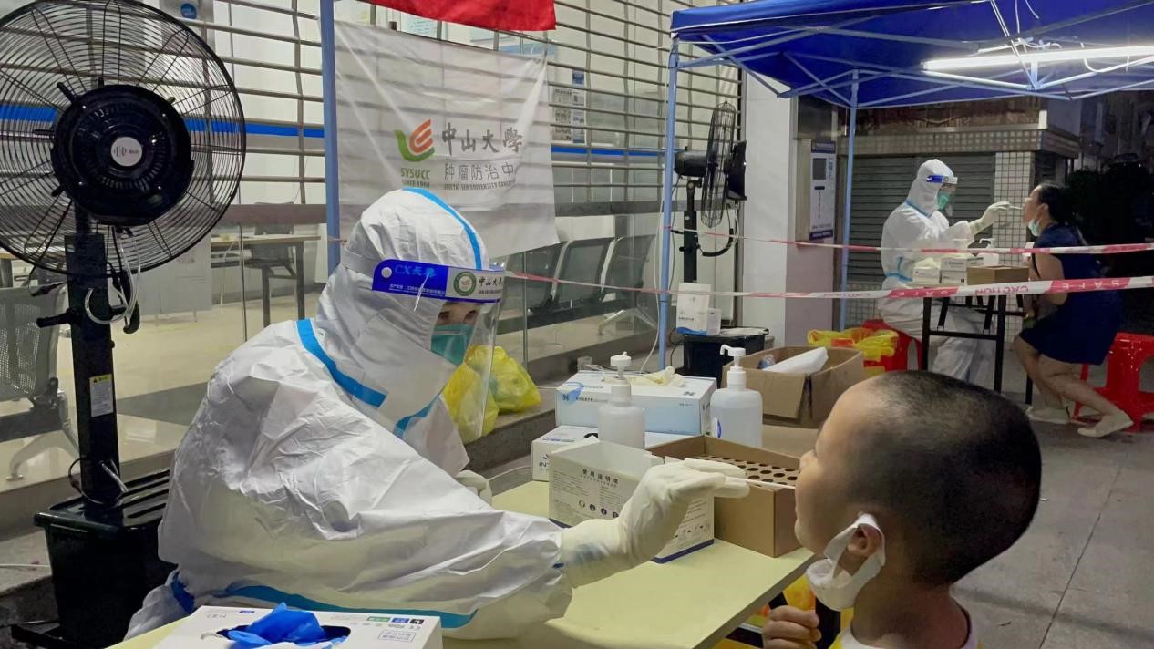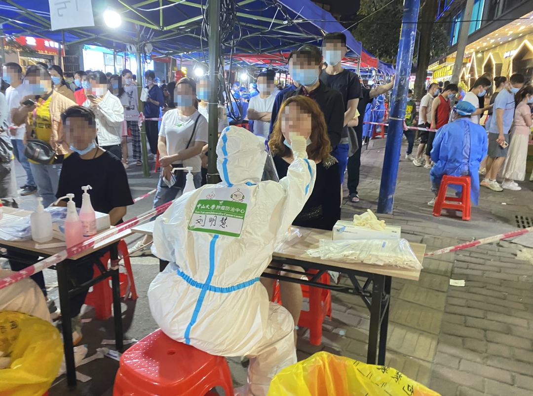 4月15日,中肿派出了150余人的核酸采样队员,他们在广州市白云区奋战了三天两夜。4月21日,中肿又派出了160余人的核酸采样支援队。