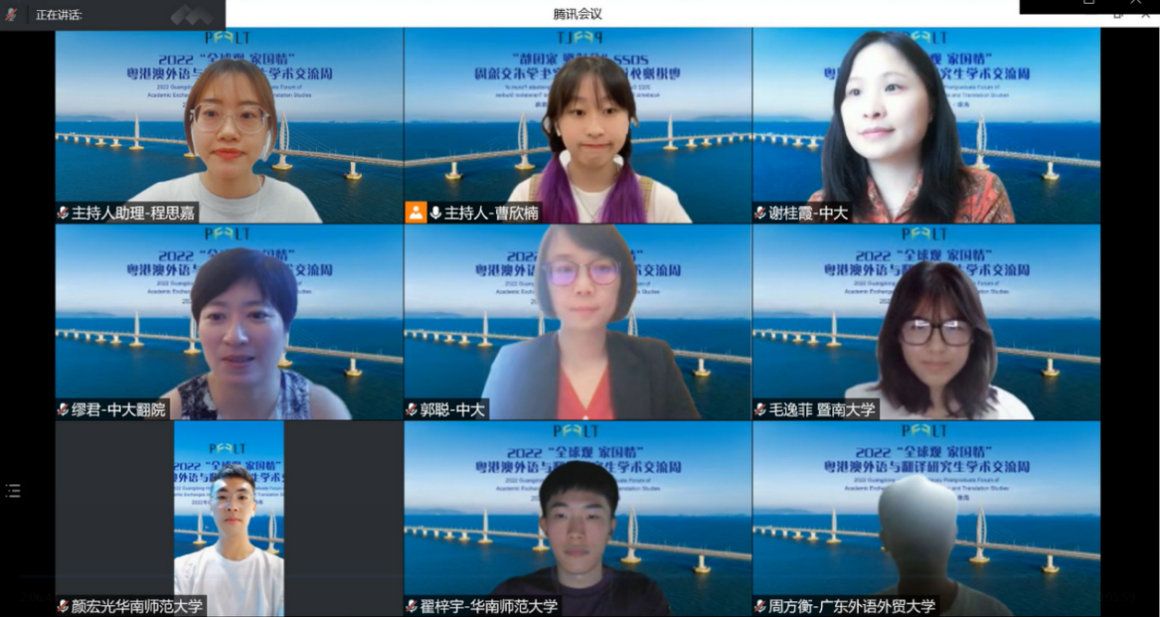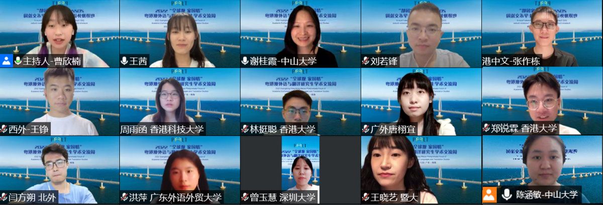 2022“全球观 家国情”粤港澳外语与翻译研究生学术交流周前身为粤港澳外语与翻译研究生学术论坛,经过七年的发展,活动不断走向成熟,成为三地青年学子交流学术、增进友谊的桥梁。本届学术交流周既契合粤港澳大湾区发展背景,助力粤港澳地区协同发展,也在促进粤港澳师生交流学术文化、培养外语人才、弘扬家国情怀方面发挥了重要作用。