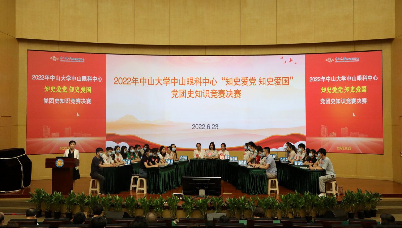 中大新闻网广州6月28日电(通讯员唐艳丽)为深入学习贯彻习近平新时代中国特色社会主义思想,引导广大党员、团员知史爱党、知史爱国,推动党史学习教育常态化长效化,为迎接党的二十大胜利召开营造浓厚氛围,在“七一”到来之际,6月23日下午,中山眼科中心党委在珠江新城院区实验楼学术报告厅举办了2022年“知史爱党 知史爱国”党团史知识竞赛决赛。本次活动的主题是“喜迎二十大,永远跟党走,奋进新征程”。中心党委委员、纪委委员等出席活动,各支部党员、发展对象、入党积极分子代表,以及团员青年代表等到场观赛学习。