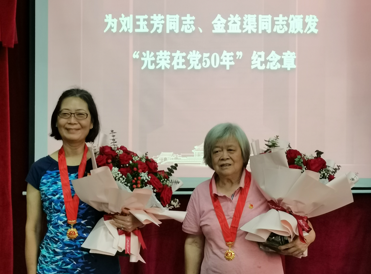 金益渠、刘玉芳先后发表感言,深情回顾了个人的入党经历和在党的悉心教育培养下的成长故事,表达对党的感恩之情,表示将继续保持退休不褪色,永远跟党走。