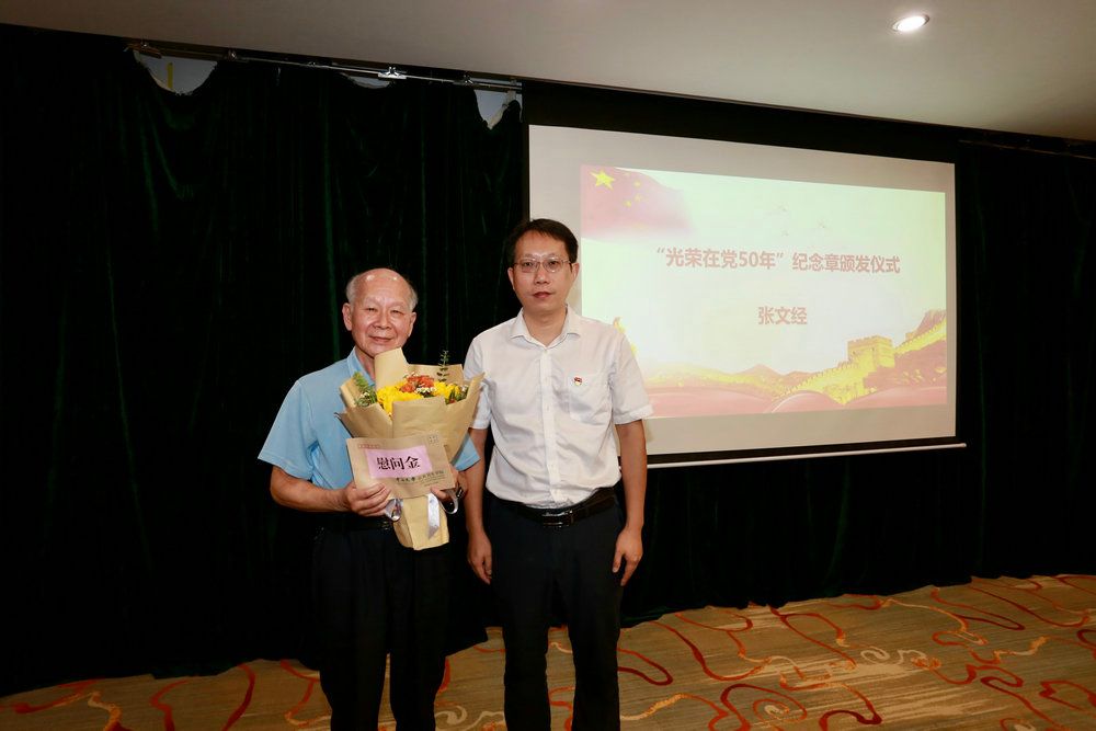 范瑞泉书记首先代表学院党委向学院全体党员致以节日的问候。对获得“光荣在党50年”纪念章的张文经副教授表示热烈的祝贺,并向张文经副教授颁发了“光荣在党50年”纪念章。党委委员、院长夏敏教授向张文经副教授送上鲜花和慰问金。颁发“光荣在党50年”纪念章,既体现了党中央对老党员的关爱关怀,更是对一路拼搏奋进的老党员的充分肯定。