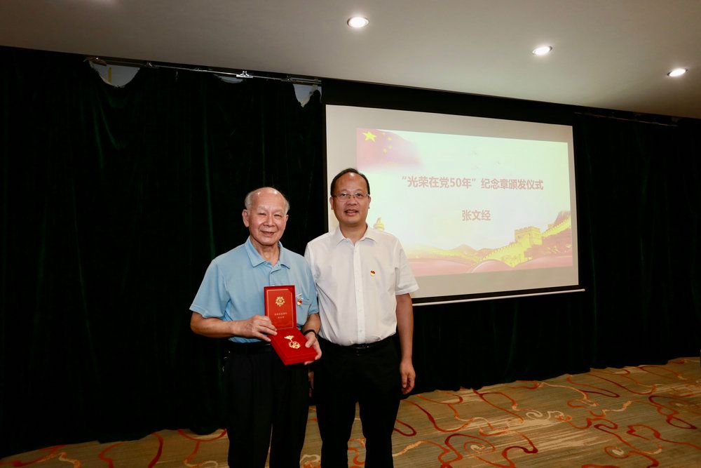 范瑞泉书记向张文经副教授颁发“光荣在党50年”纪念章(来源:公共卫生学院)