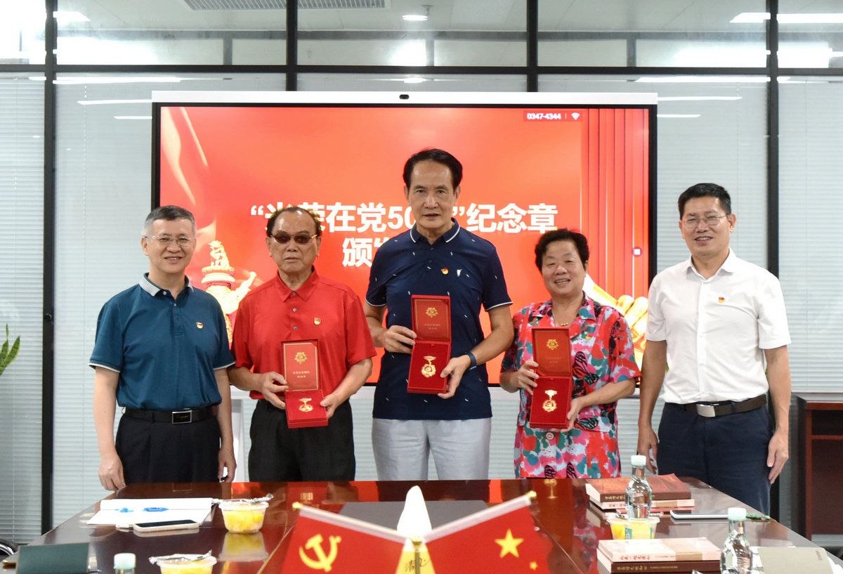 梁建、林贤娇、刘泉新三位老党员代表获颁“光荣在党50年”纪念章(来源:附属第八医院)