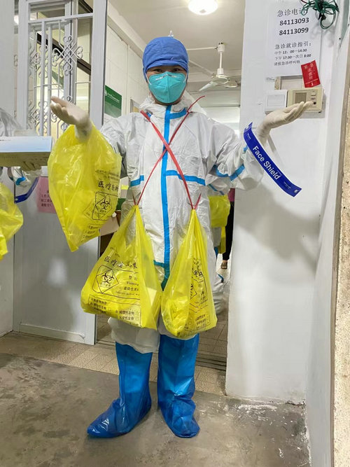为方便开展上门逐户核酸工作,孙逸仙纪念医院南校园门诊部工作人员自制“标准装备”