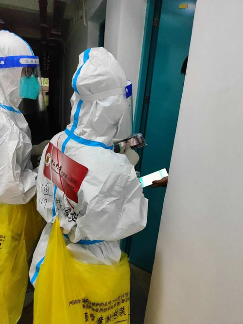 由于南校园实施“足不出户”管理模式,队员们需要“挨家挨户”进行上门采样。有的宿舍楼层最高有8层,在29℃的天气下,队员们穿着密不透风的防护服爬楼梯,汗流浃背,但大家心里想着师生平安健康,想着早点控制疫情,都毫无怨言。
