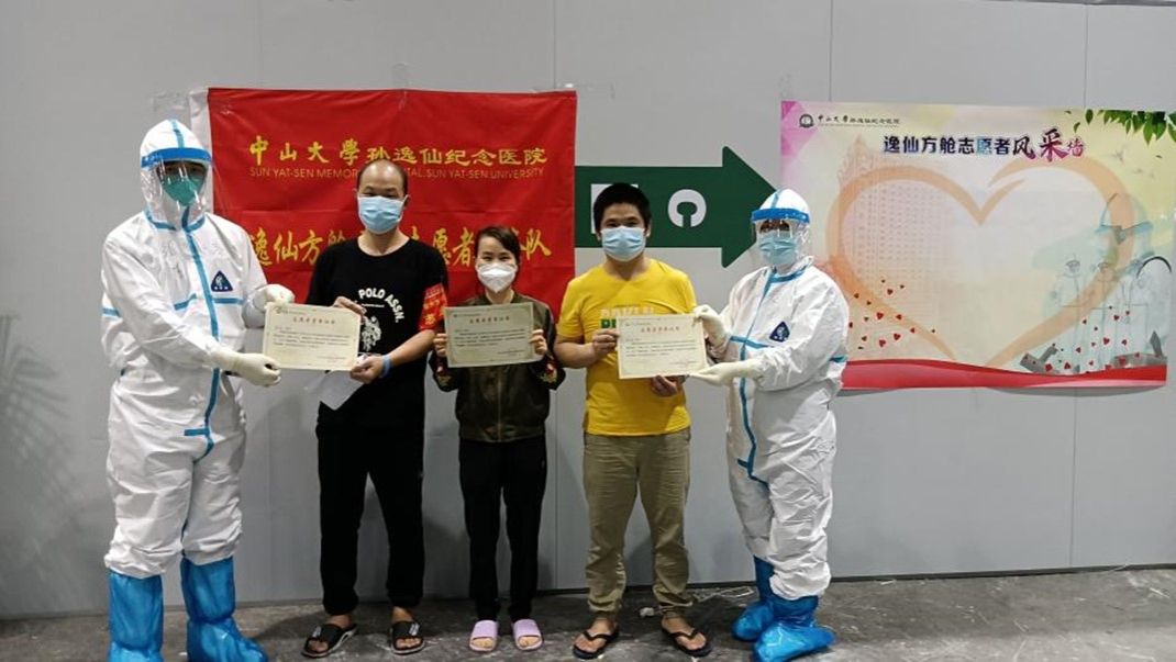 为进一步服务方舱内患者的生活需求,临时党总支还组建了逸仙青年突击队,并号召方舱内的患者踊跃报名志愿者队伍,共同携手为抗击疫情作出力所能及的贡献。倡议书发出后,前后约有80余位患者报名,其中最大的53岁,最小的仅有9岁。戴上袖章,拿上“大声公”,这些患者志愿者协助医护队员分发物资、维持核酸秩序、疏导病友情绪,成为了医疗队员与患者之间的“连心桥”。当这些志愿者康复出舱时,临时党总支和队员们还会为他们颁发志愿服务证书,感谢他们为抗疫和方舱所作出的贡献。