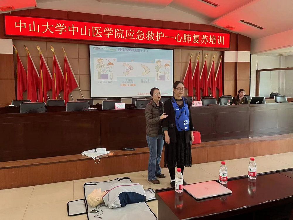 医学实验教学中心标本馆的伍慧勤老师以《紧“急”情况,“救”在身边——常用应急救护技术》为题进行健康科普讲座。伍老师介绍了气道异物梗阻和心肺复苏急救知识,王亚琼老师亲自做模特配合海姆立克急救法的实操演练。在应急救援实操演练环节,20位医学实验教学中心的老师分组指导,来自南山镇八十多名机关干部踊跃参与演练。培训结束,大部分学员已经基本掌握了急救要领和手法,学到了急救技能。