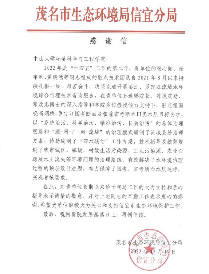 2022年高垌桥、罗定江茂名出境国考断面全年平均水质均从Ⅲ类提升至Ⅱ类,优于Ⅲ类的考核目标,水环境综合治理效果显著,共改善鉴江、罗定江流域河道及水体长度102.9公里,惠及人口67万余人,茂名市生态环境局信宜分局于2022年12月19日向我校环境科学与工程学院发来感谢信。