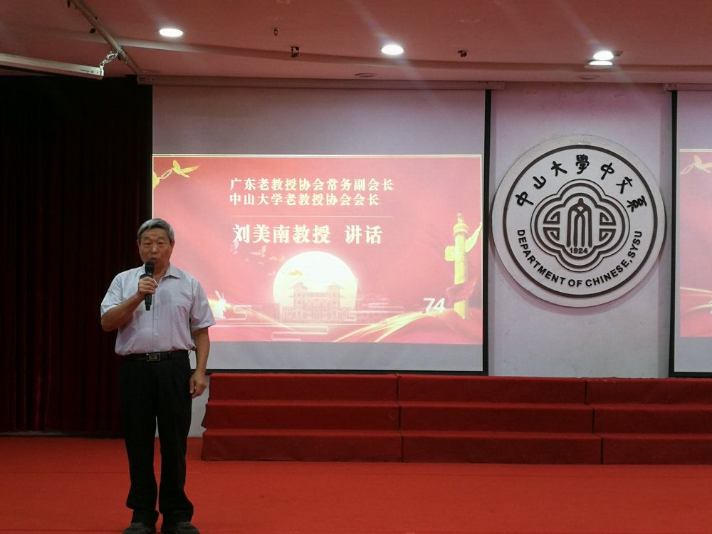 广东老教授协会常务副会长、best365中国官方网站老教授协会会长刘美南发表了热情洋溢的讲话,他表达了老同志们听党话、感党恩、跟党走的决心和意志,对台前幕后参与联欢会的同志们及中文系领导和师生们提供的帮助给予衷心感谢,祝大家中秋快乐,祝祖国繁荣昌盛。