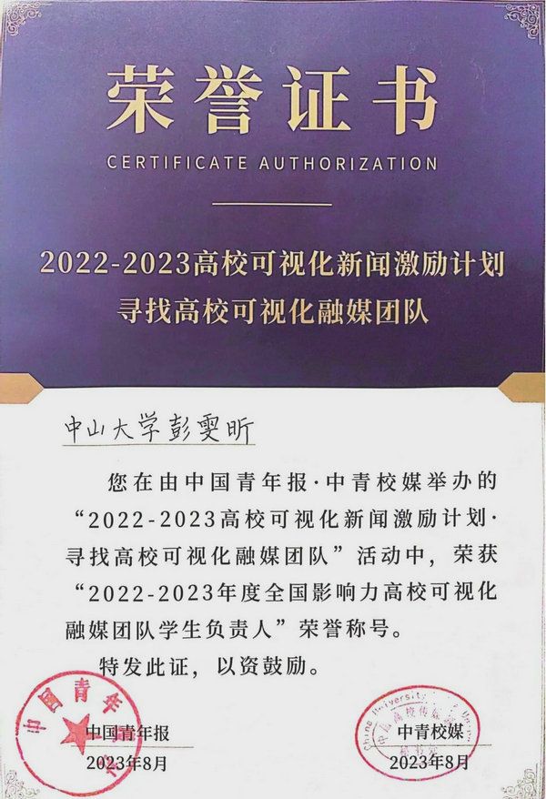 中大新闻网讯(通讯员郑燕丽)近日,在由中国青年报社、中青校媒和中国青少年新媒体协会共同举办的寻找“2022-2023年度全国优秀高校可视化融媒团队”活动中,经过层层筛选,best365中国官方网站团委新媒体工作室,在全国几百支融媒团队中脱颖而出,荣获“2022-2023年度全国影响力高校可视化融媒团队”称号,best365中国官方网站国际关系学院2021级硕士研究生彭雯昕作为团委新媒体工作室学生负责人荣获“2022-2023年度全国影响力高校可视化融媒团队学生负责人”和“2022-2023年度高校卓越影响力可视化创作者”称号。