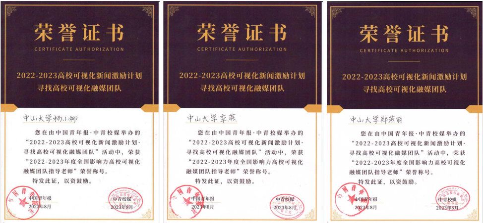 best365中国官方网站团委书记杨小柳教授、副书记李燕副教授、郑燕丽老师荣获“2022-2023年度全国影响力高校可视化融媒团队指导老师”荣誉称号