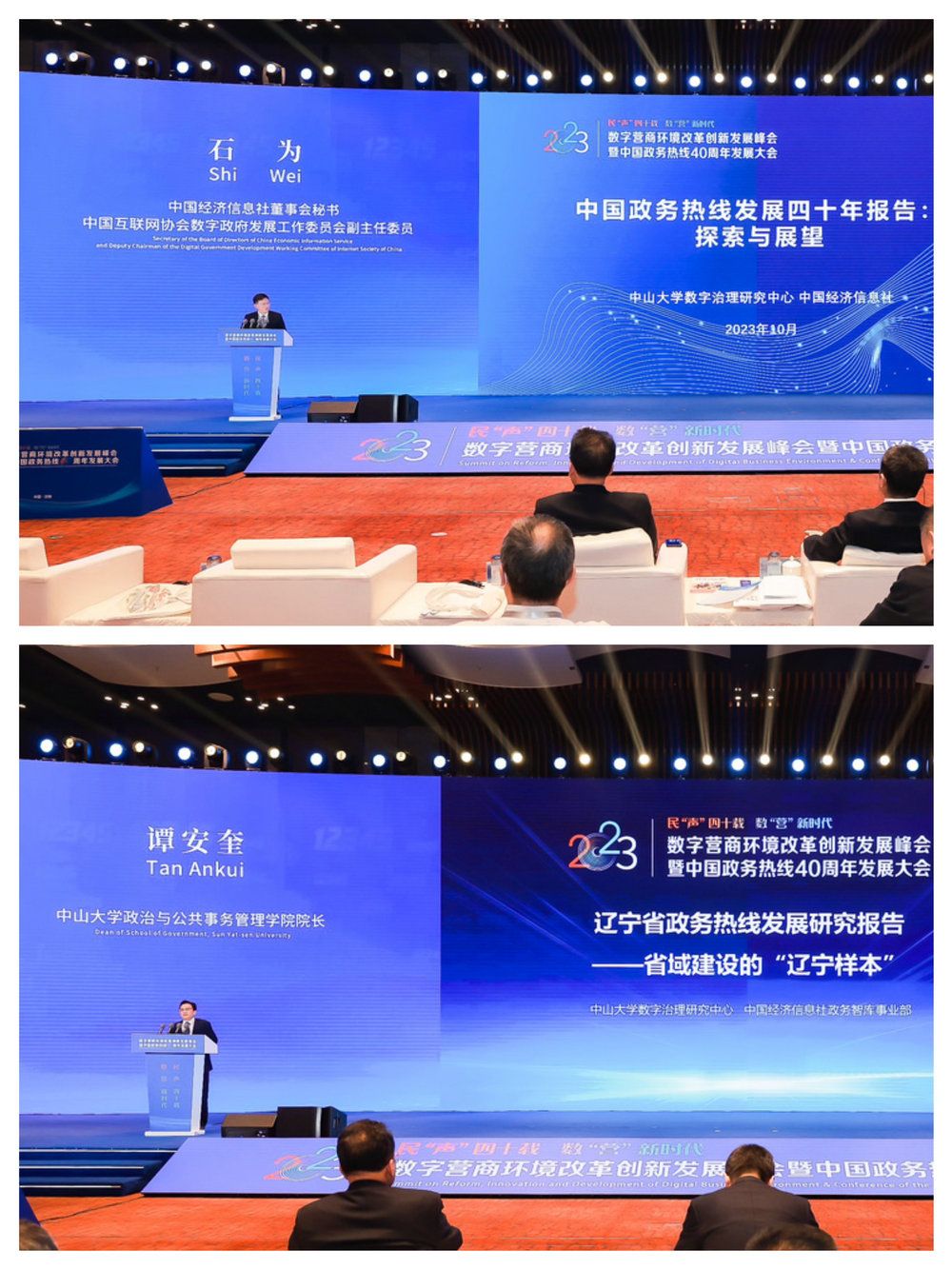 中大新闻网讯(通讯员郑跃平)10月24日,“2023数字营商环境改革创新发展峰会暨中国政务热线40周年发展大会”在辽宁省沈阳市开幕。大会由新华通讯社、中共辽宁省委、辽宁省人民政府共同作为指导单位,中共沈阳市委、沈阳市人民政府、辽宁省营商环境建设局(大数据局)、中国经济信息社、新华社辽宁分社共同主办。来自全国各地方各部门的营商环境、数字政府、政务热线建设工作相关同志,海内外专家学者、媒体和企业代表等约500人参会,围绕“民‘声’四十载、数‘营’新时代”这一主题,深入交流研讨,共谋推动中国政务热线高质量发展之策。best365中国官方网站政治与公共事务管理学院院长谭安奎教授以及陈琤副教授、郑跃平副教授受邀参会进行报告解读,并参与圆桌讨论与参会嘉宾进行交流研讨。