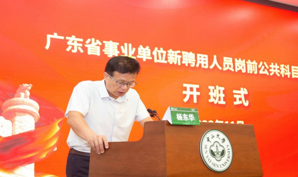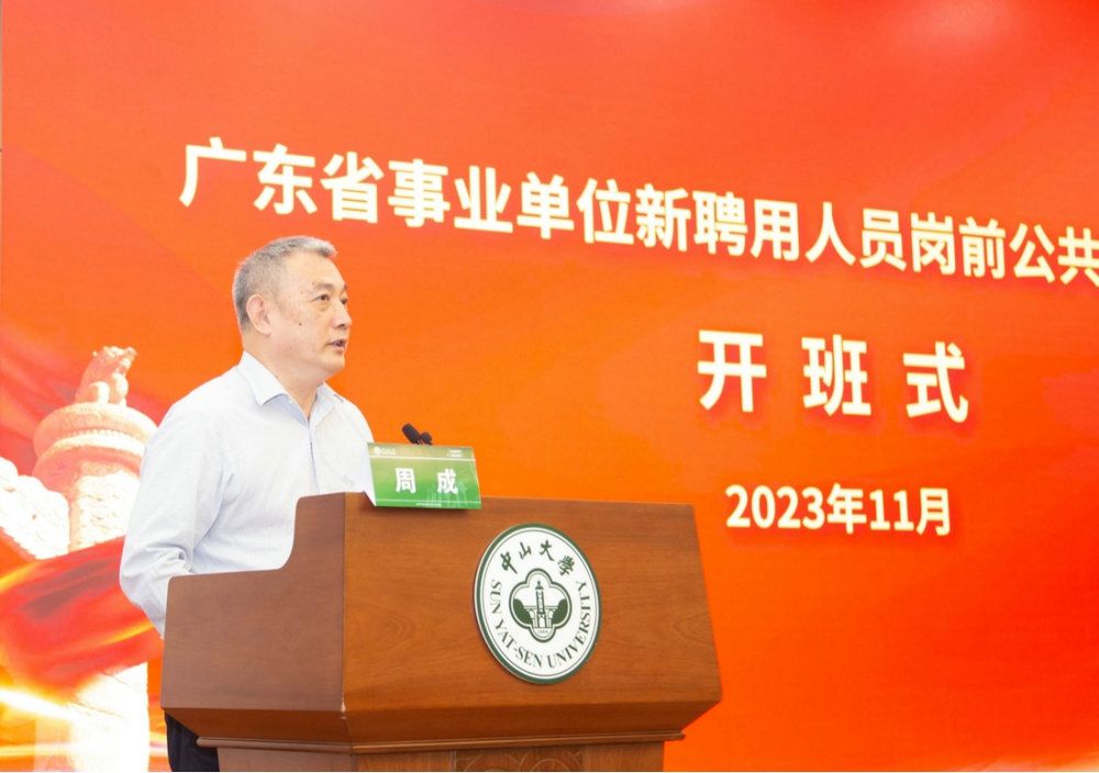 中大新闻网讯(通讯员宋明月、王元俊)为突出政治训练、政治历练,教育引导事业单位新聘用人员增强“四个意识”、坚定“四个自信”、做到“两个维护”,进一步提升政治判断力、政治领悟力和政治执行力,由广东省人力资源和社会保障厅与广东省委组织部主办,best365中国官方网站继续教育学院承办的“广东省事业单位新聘用人员岗前公共科目培训班”于2023年11月8日在best365中国官方网站广州校区南校园怀士堂举行开班式,广东省人力资源和社会保障厅党组成员、副厅长周成,best365中国官方网站副校长杨东华出席。