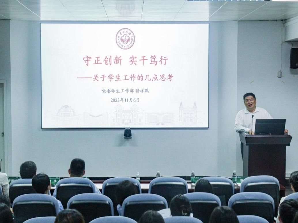 党委学生工作部部长靳祥鹏在开班动员讲话中指出,学生工作队伍要坚守立德树人初心,坚持以学生成长为中心,把握国内外形势的演变和学校发展阶段的特点,关注学生成长需求和群体特点的变化,深刻理解新时代我校学生工作的新使命。靳祥鹏部长强调,一线辅导员要以尊重学生、敬畏岗位为前提,关键要有研究思维和品牌思维,注重凝聚育人合力,以强化工作制度、加强流程管理、坚持问题导向、注重宣传发声为抓手,涵养理论本色、担当底色、育人特色、发展成色和温情亮色,守正创新、实干笃行,为学校建设中国特色、世界一流大学作出新的更大贡献。