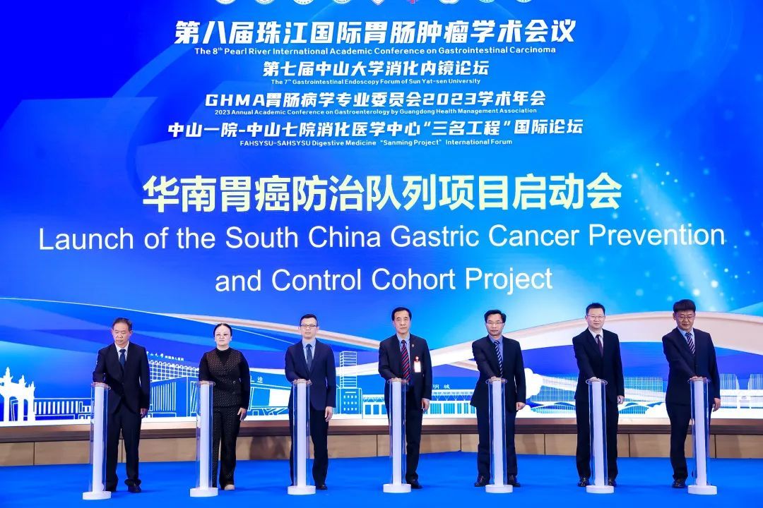 2017年中山七院还未开业时,便在云南凤庆开始开展胃癌早筛项目,取得显著成效。在12月9日的主会场,中山七院联合云南省凤庆县人民医院、云南省凤庆县中医院、潮州市潮安区人民医院、深圳市龙岗区第二人民医院、东莞市大朗医院、东莞市长安医院共同启动华南胃癌防治队列项目。至此,中山七院牵头建立的综合、全面的胃癌“筛查、诊断、治疗”三位一体防治体系为华南乃至全国胃癌防治提供新模式。同时,中山七院消化医学中心也为消化道肿瘤患者构建起了全生命周期的“肿瘤一站式终身服务”平台。
