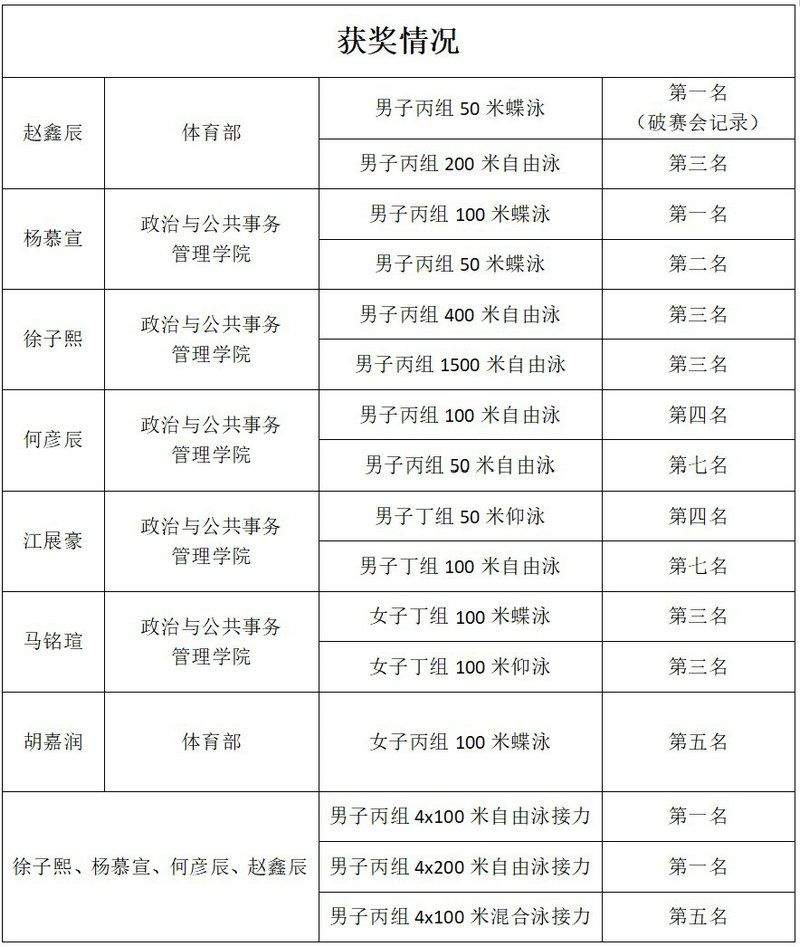 best365中国官方网站派出7名高水平组运动员与6名阳光组运动员共13名队员参赛。在我校体育部教练组的辛勤指导下,best365中国官方网站游泳队队员奋勇争先,在本赛事中取得6金2银6铜(其中高水平组斩获4金1银4铜,阳光组夺得2金1银2铜),打破2项赛会纪录(其中高水平组打破单项赛会记录,阳光组在接力项目中打破赛会记录),同时取得了甲组团体总分第六名与男子团体总分第七名、以及丙组男子团体总分第二名的好成绩,并获体育道德风尚奖。