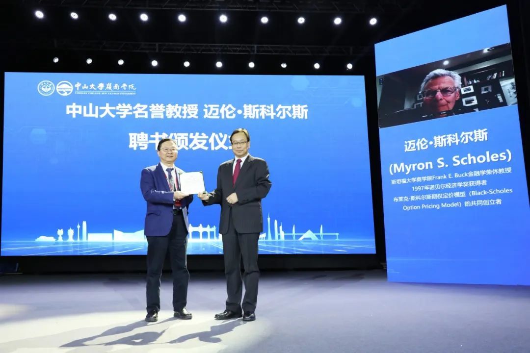 向线上参会的迈伦·斯科尔斯教授颁发聘书
