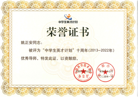 中大新闻网讯(通讯员朱珈奇)新学期伊始,数学学院姚正安教授获评由中国科协办公厅和教育部办公厅共同颁发的“‘中学生英才计划’十周年(2013-2022年)优秀导师”荣誉称号。